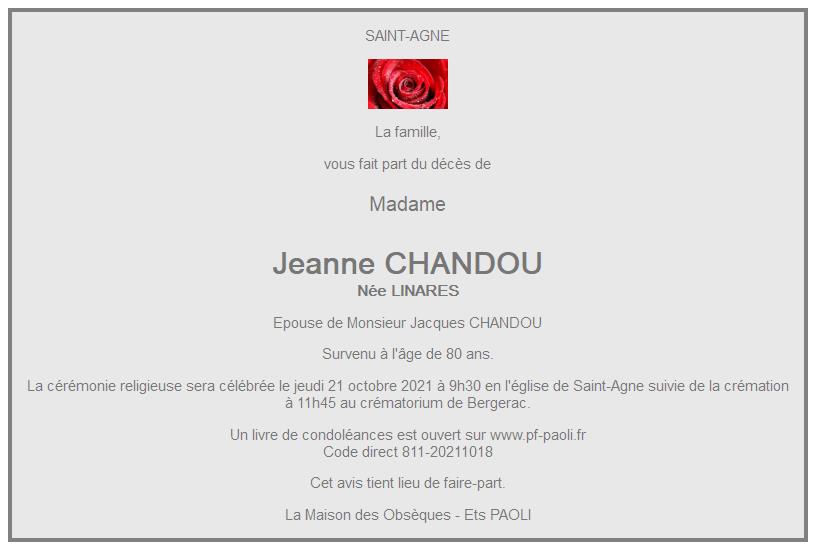 Cet espace « condoléances » est dédié à la mémoire de Madame Jeanne CHANDOU née LINARES.