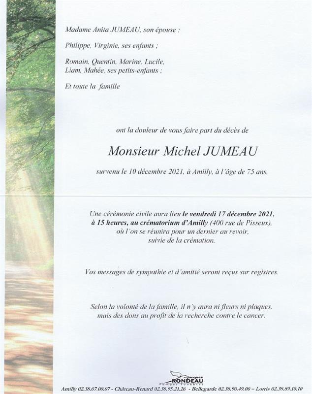 Cet espace « condoléances » est dédié à la mémoire de Monsieur Michel JUMEAU.