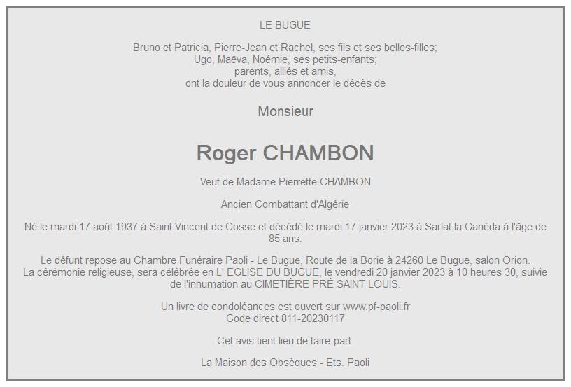 Cet espace « condoléances » est dédié à la mémoire de Monsieur Roger CHAMBON.