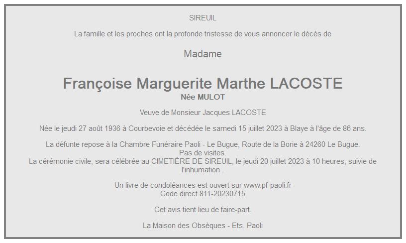 de Madame Françoise Marguerite Marthe LACOSTE née MULOT