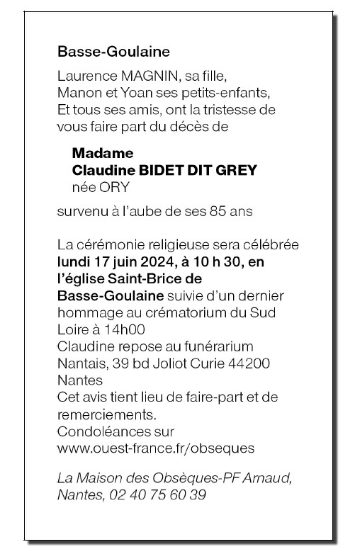 Cet espace « condoléances » est dédié à la mémoire de Madame Claudine GREY née ORY.