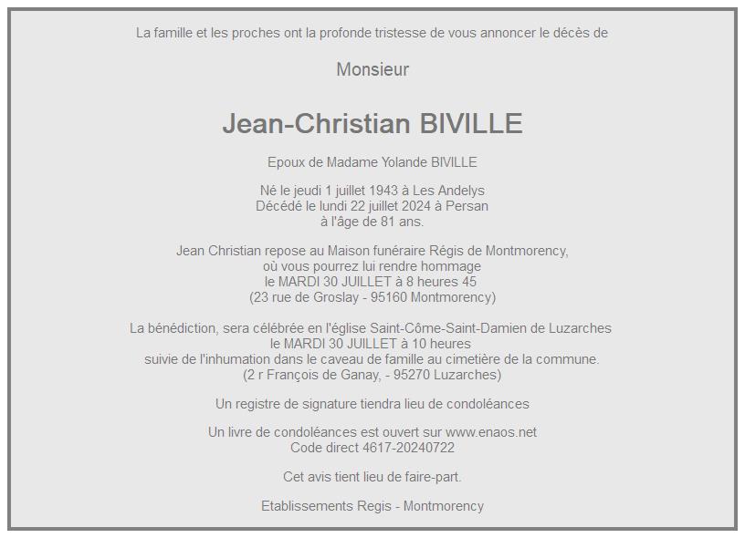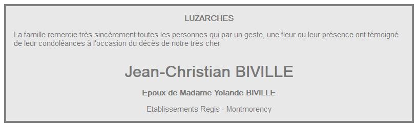 Cet espace « condoléances » est dédié à la mémoire de Monsieur Jean-Christian BIVILLE.