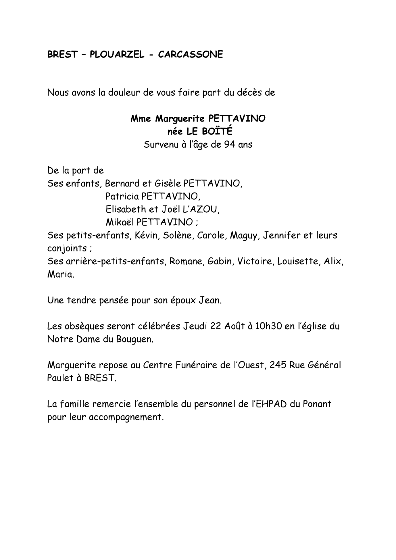 Cet espace « condoléances » est dédié à la mémoire de Madame Marguerite PETTAVINO née LE BOÏTÉ.