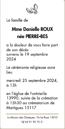 Cet espace « condoléances » est dédié à la mémoire de Madame Danielle ROUX née PIERRE-BES.