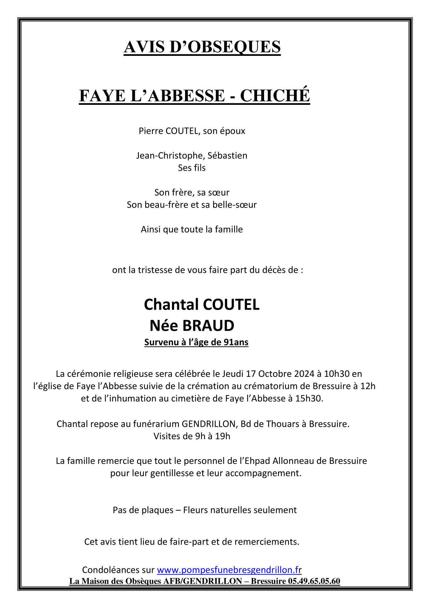 Cet espace « condoléances » est dédié à la mémoire de Madame Chantal COUTEL née BRAUD.