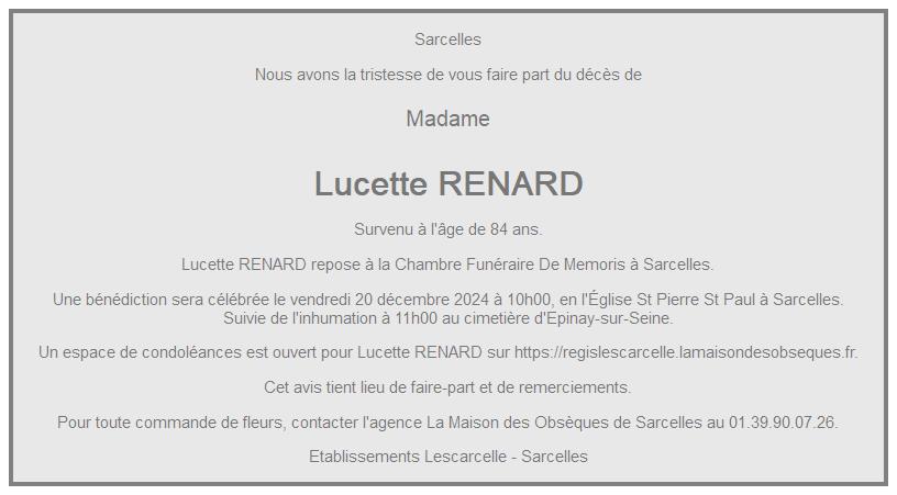 Cet espace « condoléances » est dédié à la mémoire de Madame Lucette RENARD.