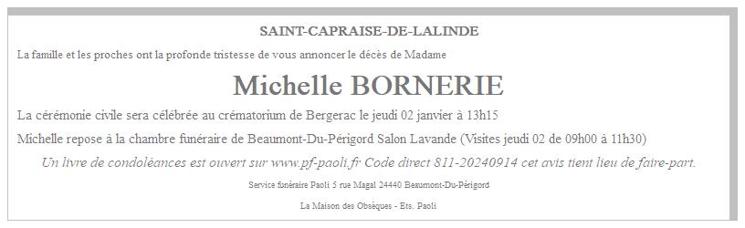 Cet espace « condoléances » est dédié à la mémoire de Madame Michelle BORNERIE.