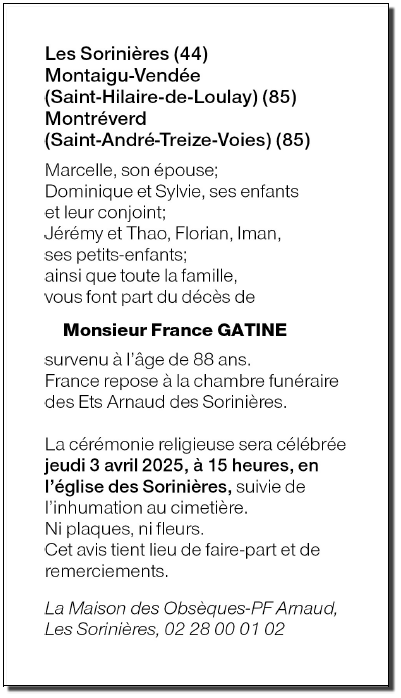 Cet espace « condoléances » est dédié à la mémoire de Monsieur France GATINE.