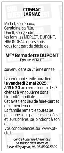 Cet espace « condoléances » est dédié à la mémoire de Madame Bernadette MERLET née DUPONT.