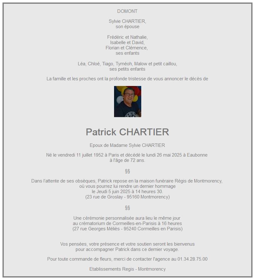 Cet espace « condoléances » est dédié à la mémoire de Monsieur Patrick CHARTIER.