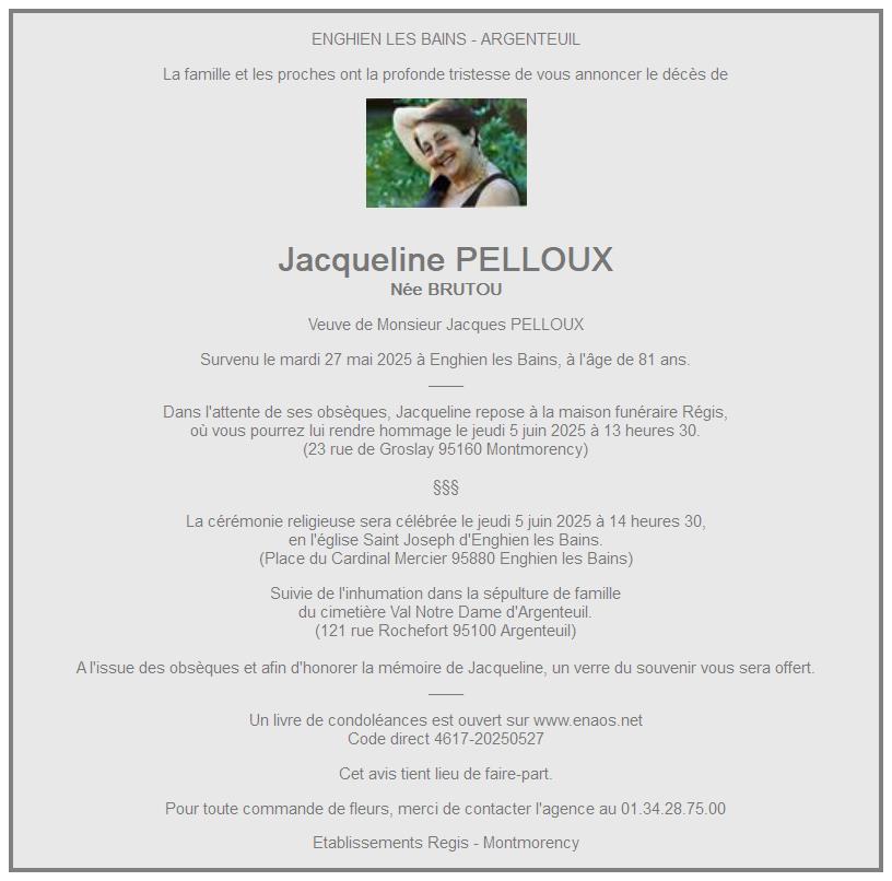 Cet espace « condoléances » est dédié à la mémoire de Madame Jacqueline PELLOUX née BRUTOU.