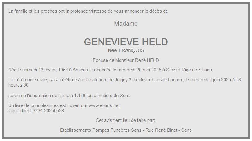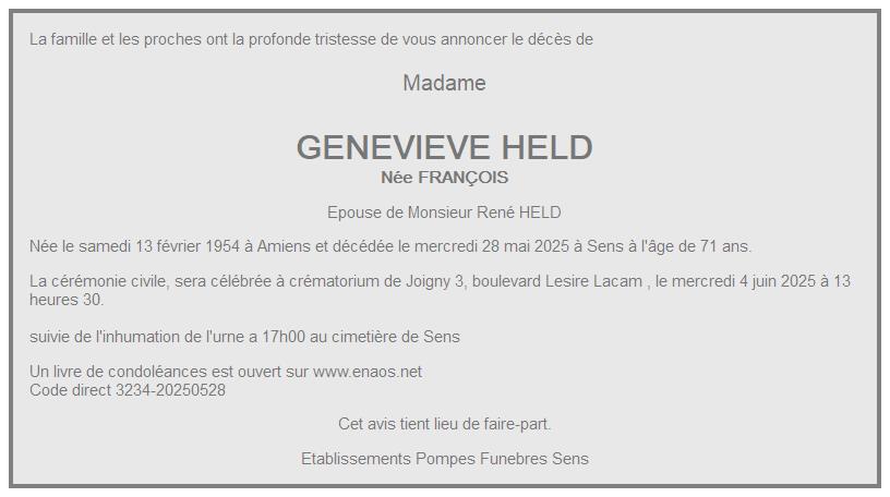 de Madame GENEVIEVE HELD née FRANÇOIS
