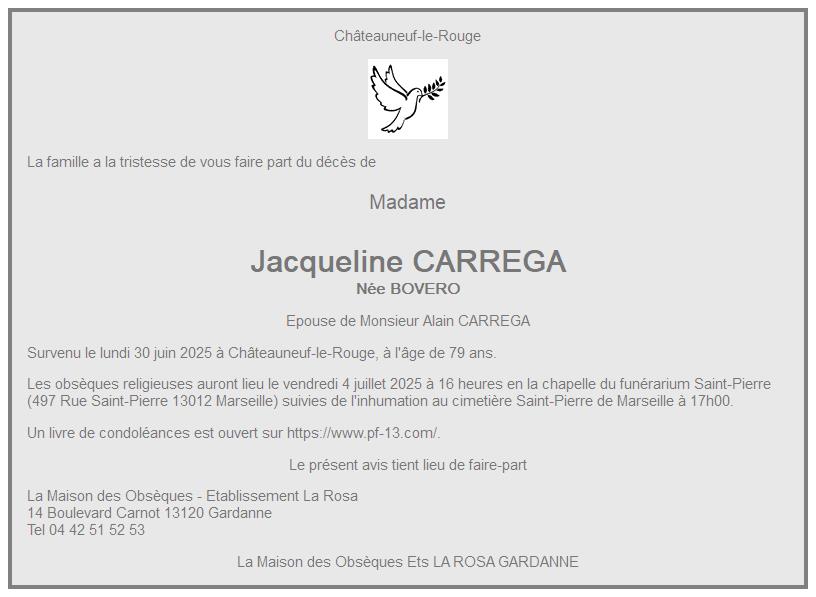 Cet espace « condoléances » est dédié à la mémoire de Madame Jacqueline CARREGA née BOVERO.