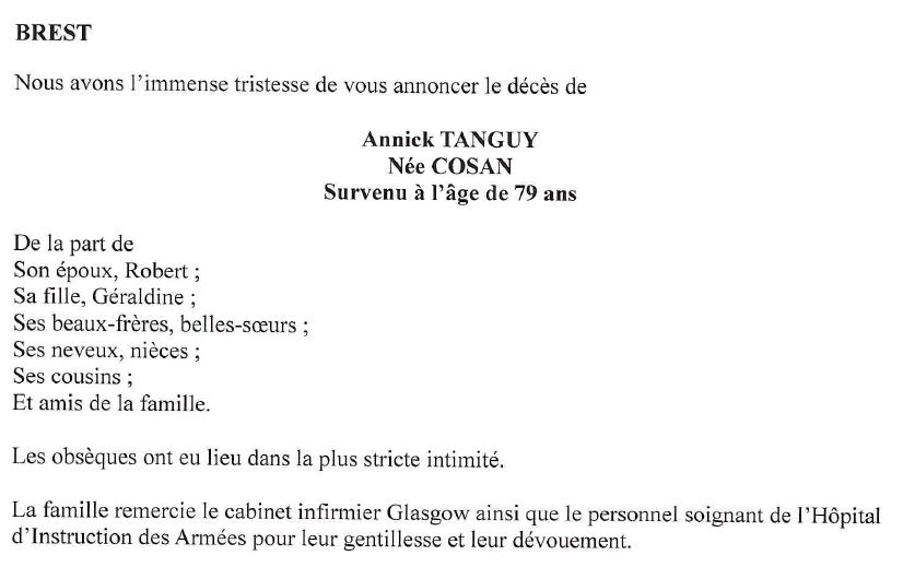 Cet espace « condoléances » est dédié à la mémoire de Madame Annick TANGUY née COSAN.