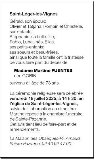 Cet espace « condoléances » est dédié à la mémoire de Madame Martine FUENTES née GOBIN.