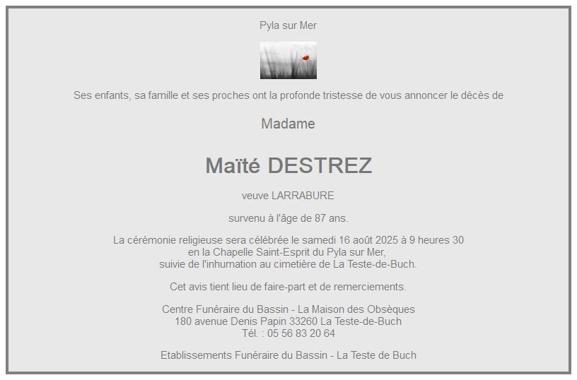 Cet espace « condoléances » est dédié à la mémoire de Madame Francine LARRABURE née DESTREZ.