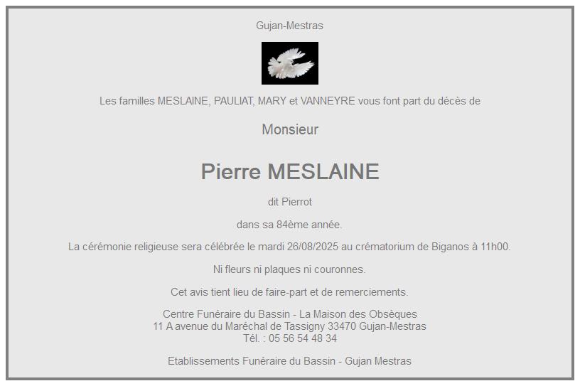Cet espace « condoléances » est dédié à la mémoire de Monsieur Pierre MESLAINE.