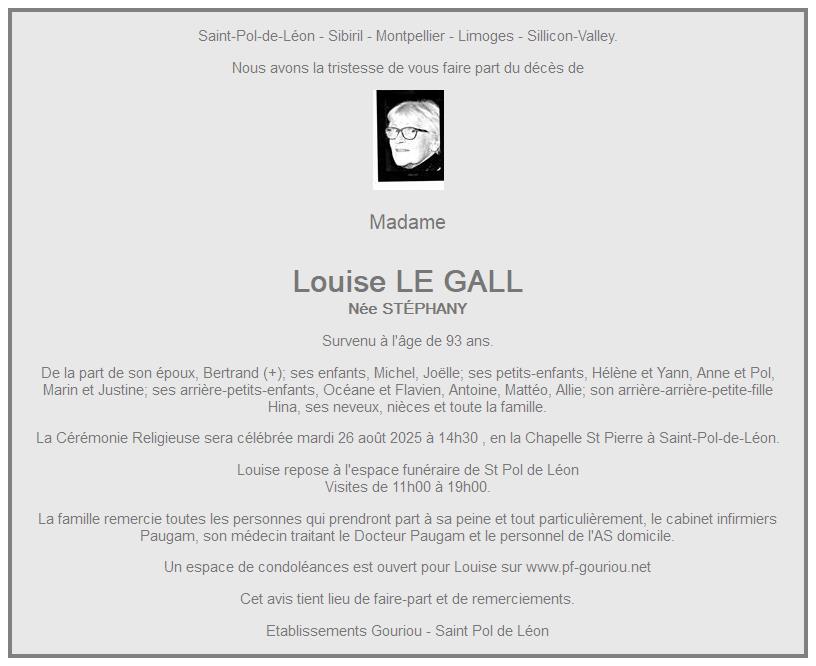 Cet espace « condoléances » est dédié à la mémoire de Madame Louise LE GALL née STÉPHANY.