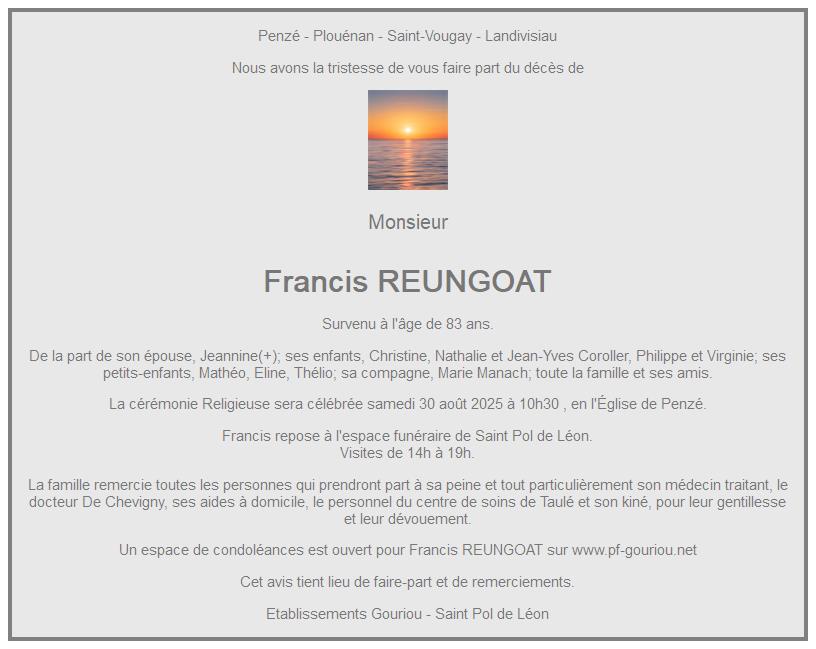 Cet espace « condoléances » est dédié à la mémoire de Monsieur Francis REUNGOAT.