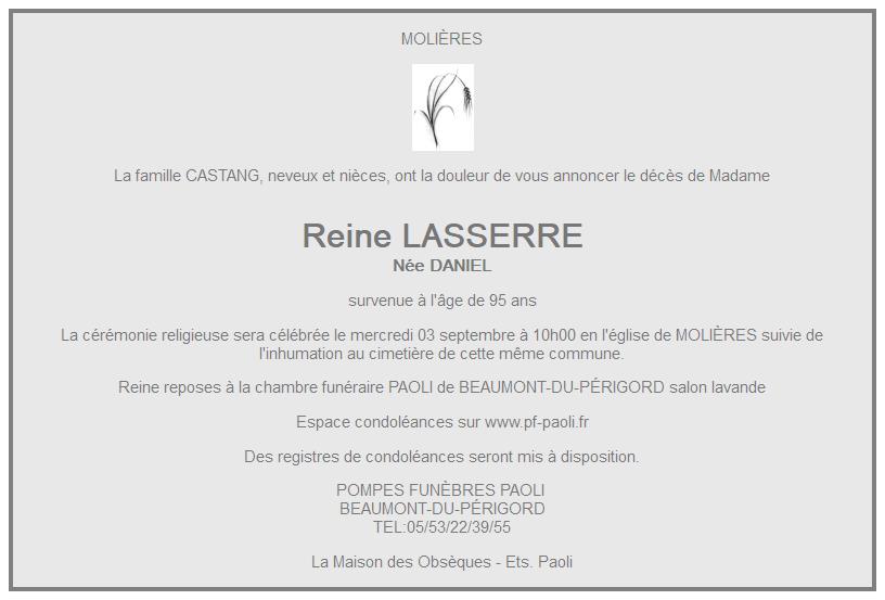 Cet espace « condoléances » est dédié à la mémoire de Madame Reine LASSERRE née DANIEL.