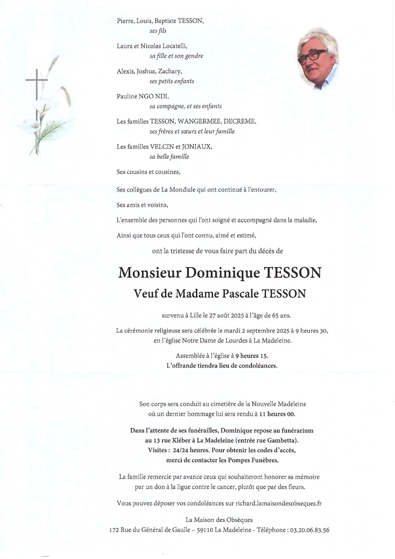 Cet espace « condoléances » est dédié à la mémoire de Monsieur Dominique TESSON.