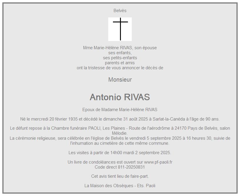 Cet espace « condoléances » est dédié à la mémoire de Monsieur Antonio RIVAS.