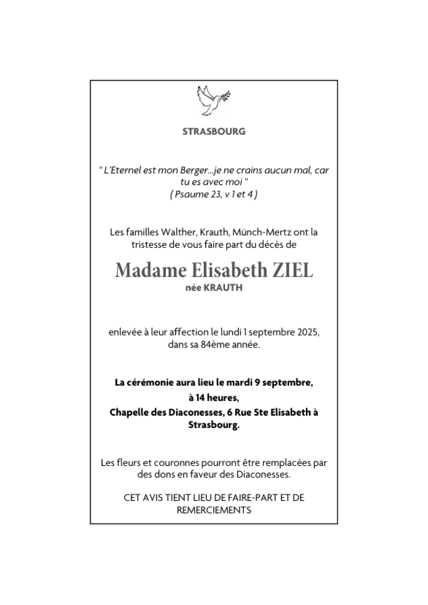 Cet espace « condoléances » est dédié à la mémoire de Madame Elisabeth ZIEL née KRAUTH.