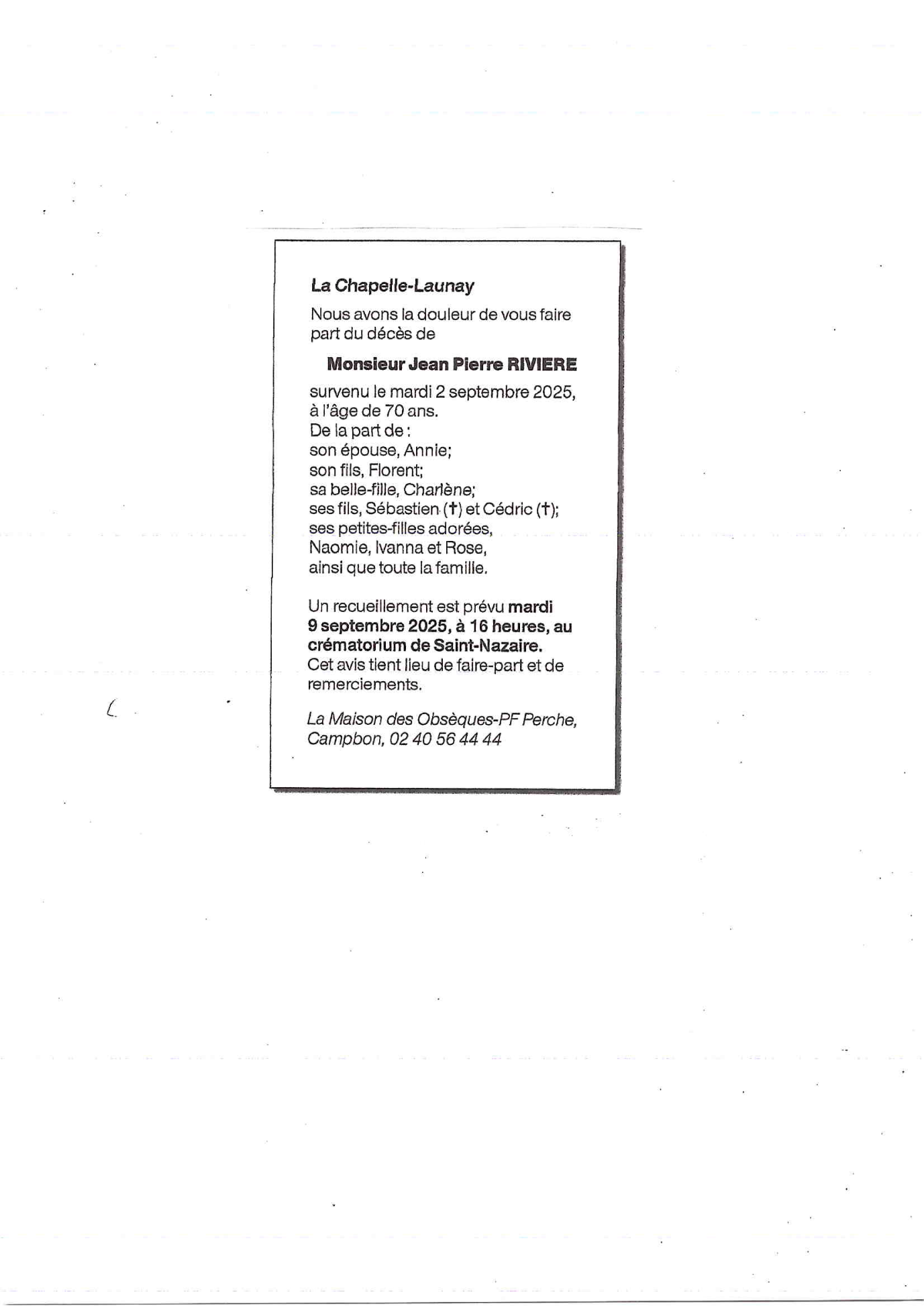 Cet espace « condoléances » est dédié à la mémoire de Monsieur Jean Pierre RIVIERE.