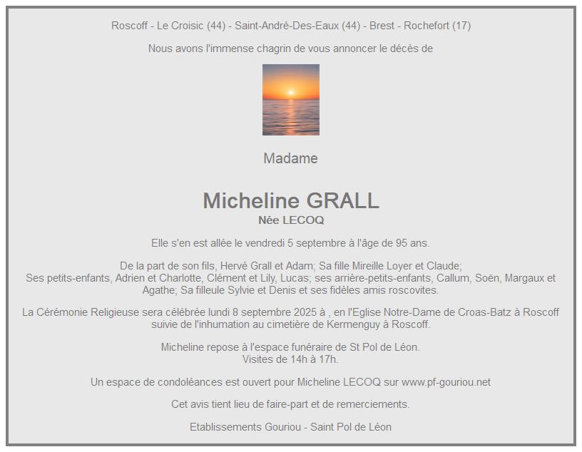 Cet espace « condoléances » est dédié à la mémoire de Madame Micheline GRALL née LECOQ.