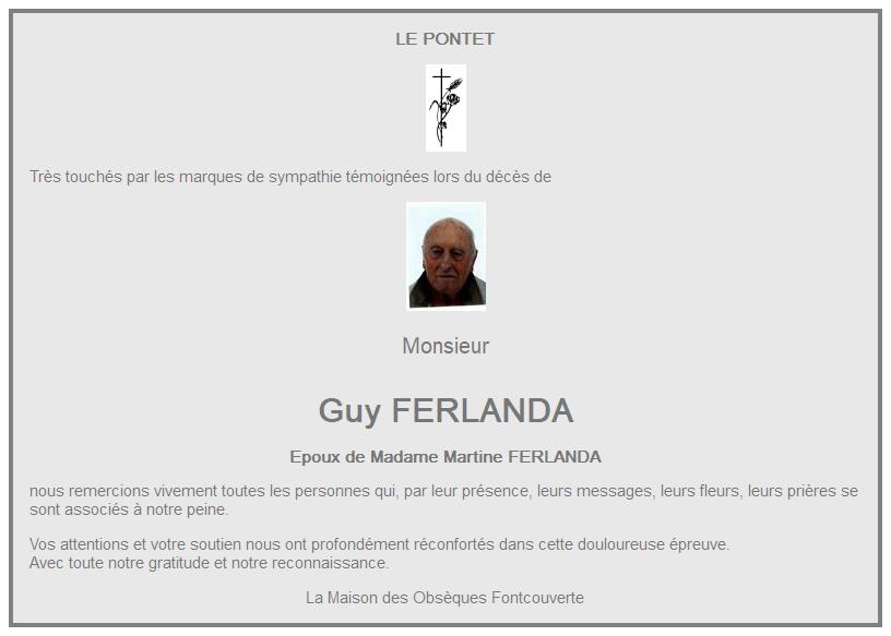 Cet espace « condoléances » est dédié à la mémoire de Monsieur Guy FERLANDA.
