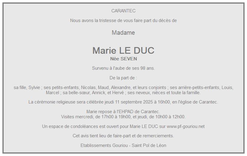 Cet espace « condoléances » est dédié à la mémoire de Madame Marie LE DUC née SEVEN.