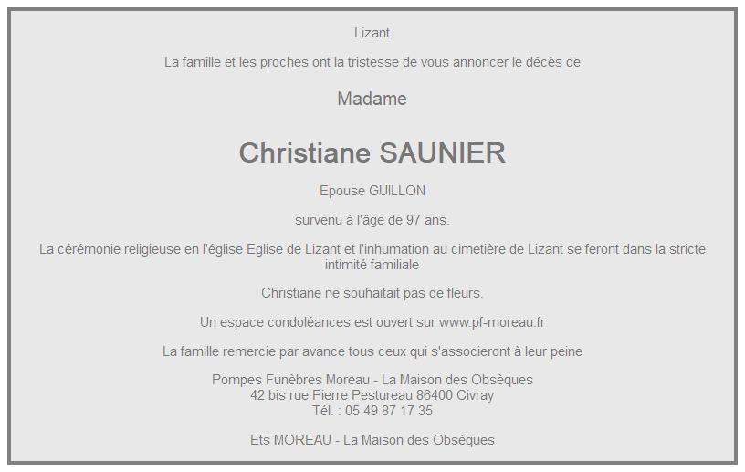 Cet espace « condoléances » est dédié à la mémoire de Madame Christiane GUILLON née SAUNIER.