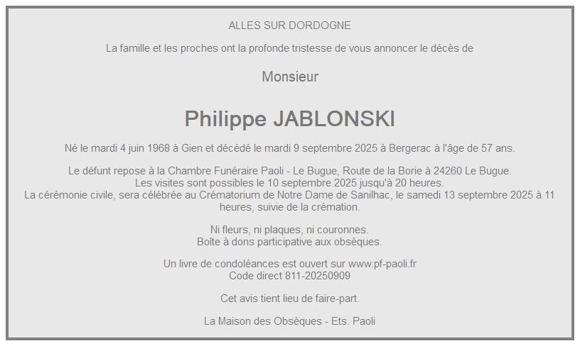Cet espace « condoléances » est dédié à la mémoire de Monsieur Philippe JABLONSKI.