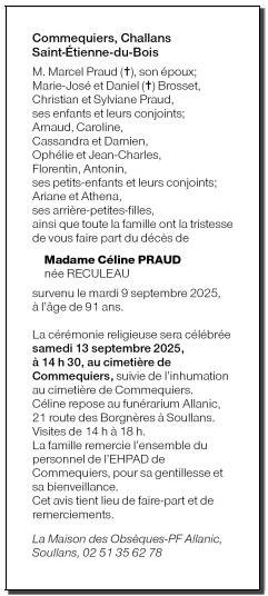 Cet espace « condoléances » est dédié à la mémoire de Madame Céline PRAUD née RECULEAU.