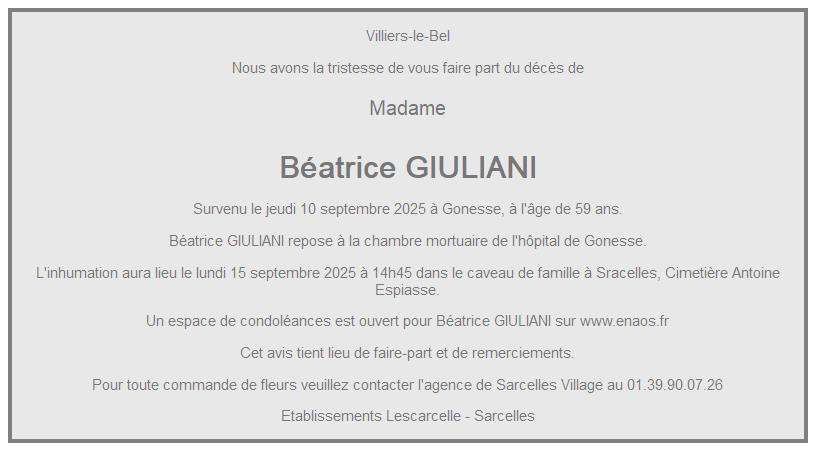 Cet espace « condoléances » est dédié à la mémoire de Madame Béatrice GIULIANI.