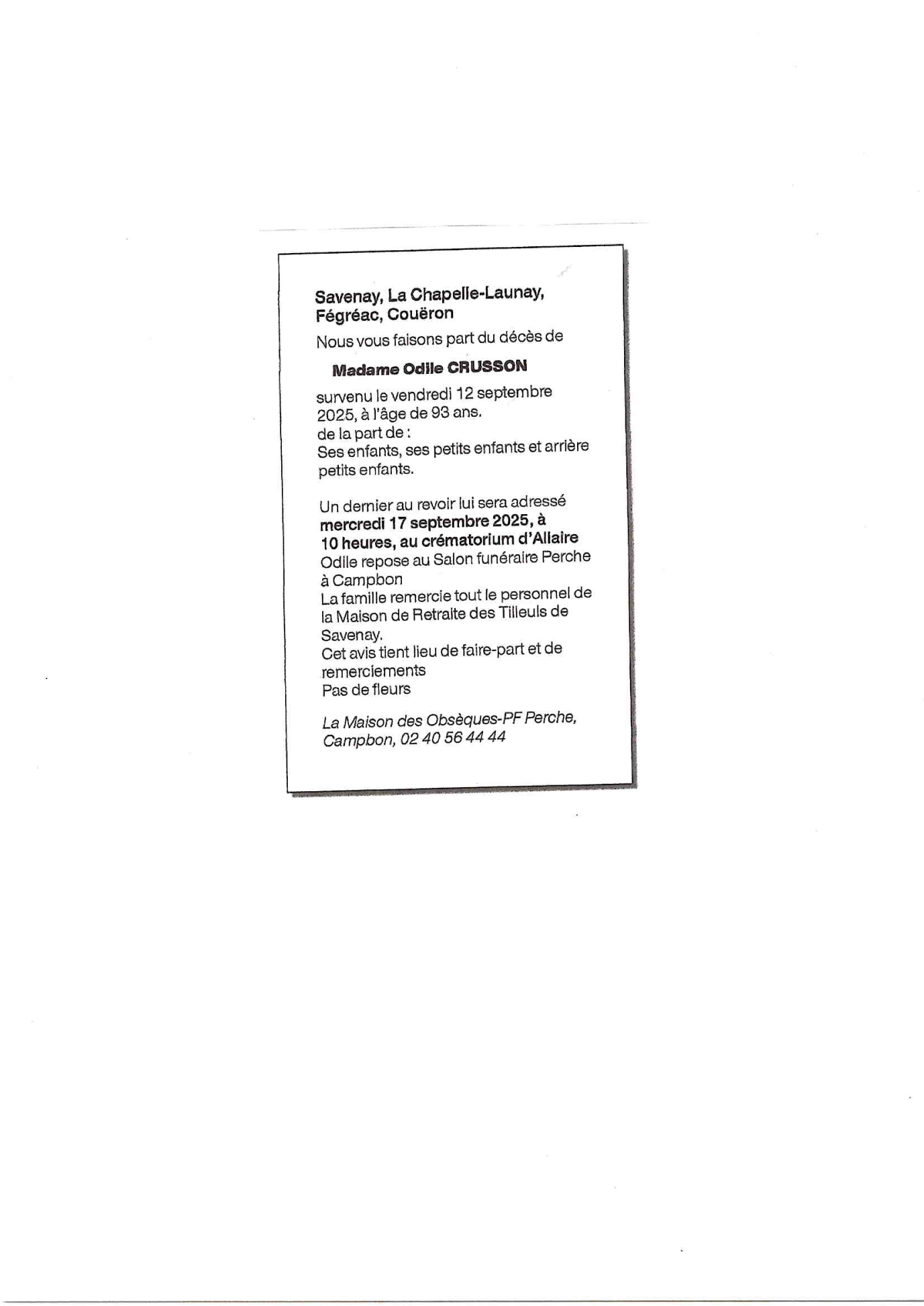 Cet espace « condoléances » est dédié à la mémoire de Madame ODILE CRUSSON.