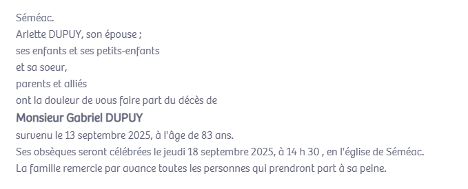 Cet espace « condoléances » est dédié à la mémoire de Monsieur Gabriel DUPUY.