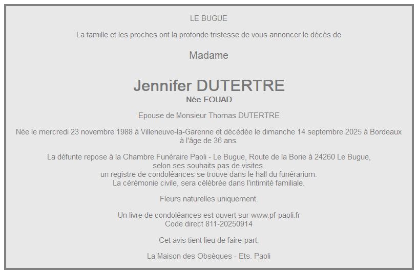 Cet espace « condoléances » est dédié à la mémoire de Madame Jennifer DUTERTRE née FOUAD.