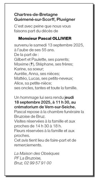 Cet espace « condoléances » est dédié à la mémoire de Monsieur Pascal OLLIVIER.