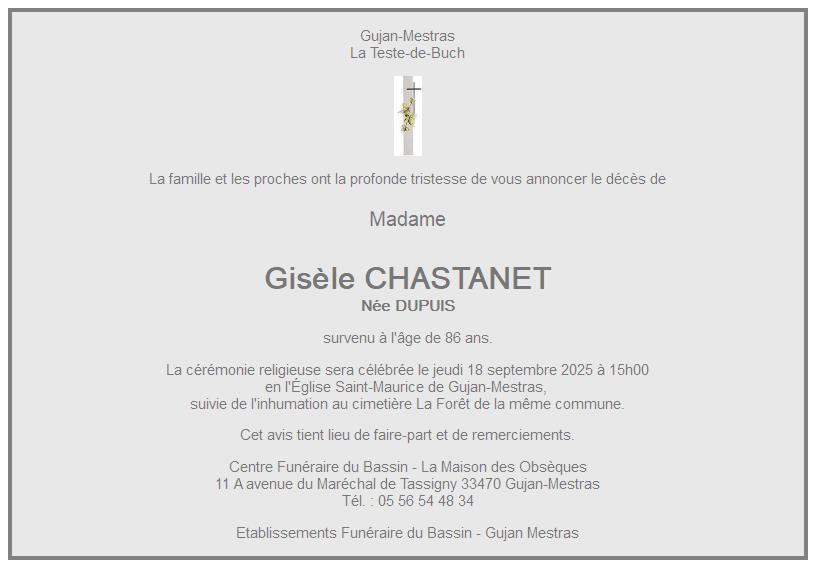 Cet espace « condoléances » est dédié à la mémoire de Madame Gisèle CHASTANET née DUPUIS.