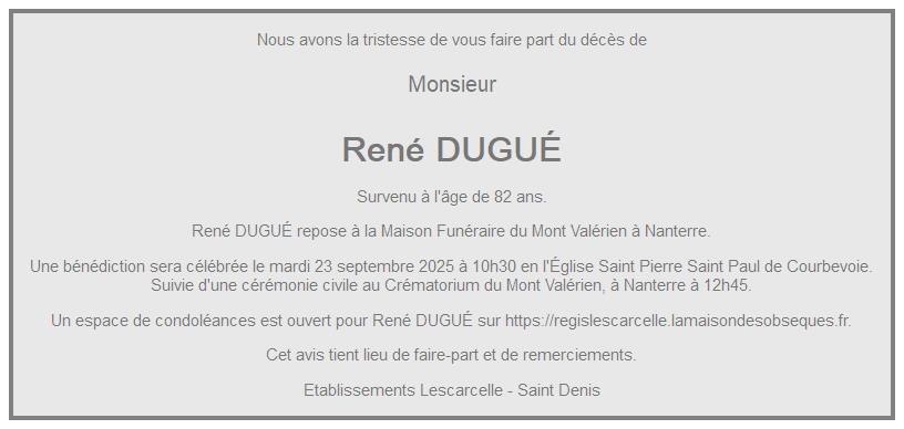 Cet espace « condoléances » est dédié à la mémoire de Monsieur René DUGUÉ.