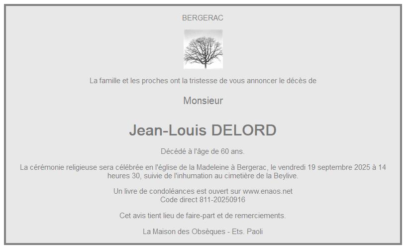 Cet espace « condoléances » est dédié à la mémoire de Monsieur Jean-Louis DELORD.