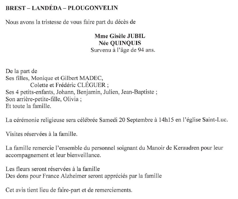 Cet espace « condoléances » est dédié à la mémoire de Madame Gisèle JUBIL née QUINQUIS.