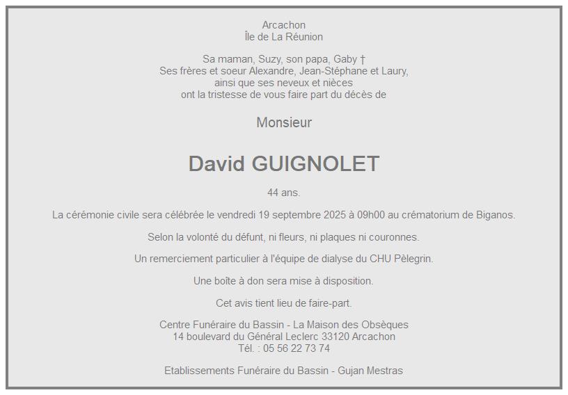 Cet espace « condoléances » est dédié à la mémoire de Monsieur David GUIGNOLET.