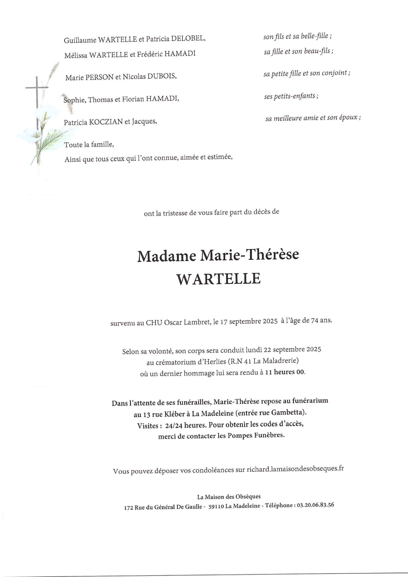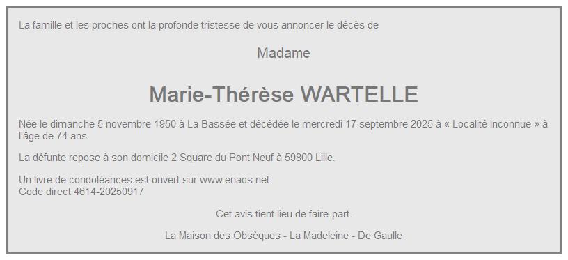 Cet espace « condoléances » est dédié à la mémoire de Madame Marie-Thérèse WARTELLE.