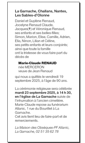 Cet espace « condoléances » est dédié à la mémoire de Madame Marie-Claude RENAUD née MERCERON.
