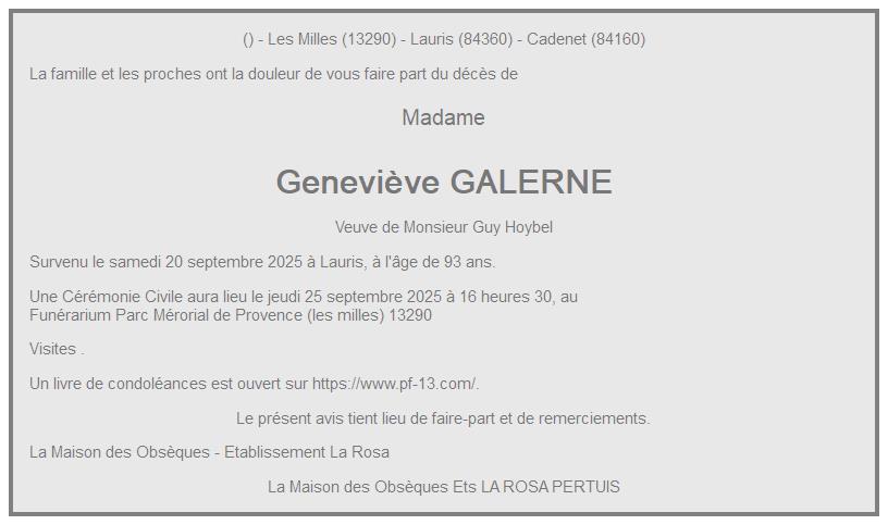 Cet espace « condoléances » est dédié à la mémoire de Madame Geneviève Hoybel née GALERNE.