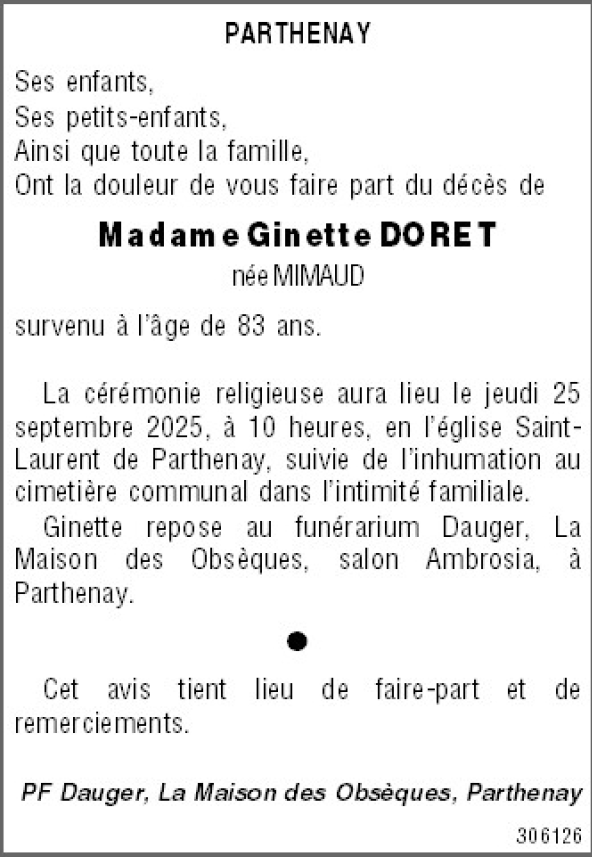 Cet espace « condoléances » est dédié à la mémoire de Madame Ginette DORET née MIMAUD.