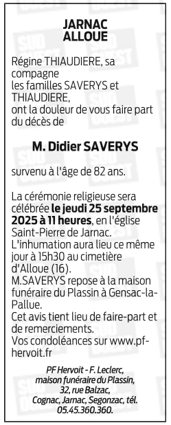 Décédé à Châteaubernard (16100) le dimanche 21 septembre 2025