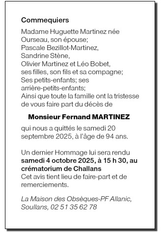 Cet espace « condoléances » est dédié à la mémoire de Monsieur Fernand MARTINEZ.